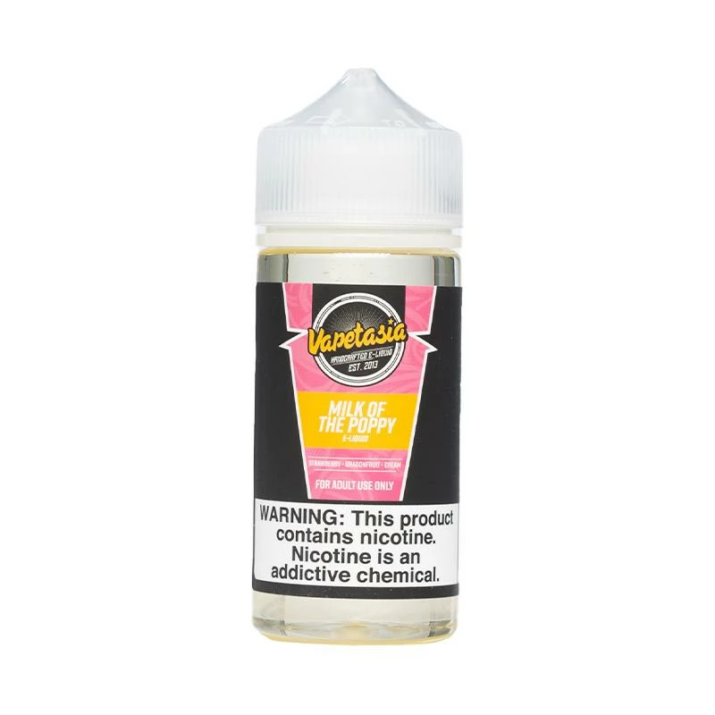 Dive headfirst into a delicious bath of fruits with this succulent blend of ripe fruits! With Milk of the Poppy E-Juice by Vapetasia, you can feast on the sweetness of fresh fruits with every puff. The inhale features a refreshing taste of ruby red strawberries, followed by a invigorating flavor of dragonfruit on the exhale. Enjoy a fruity vape juice that won’t burn your coils and is sweet enough to satisfy your fruit cravings all day long, thanks to Milk of the Poppy E-Juice by Vapetasia!Β