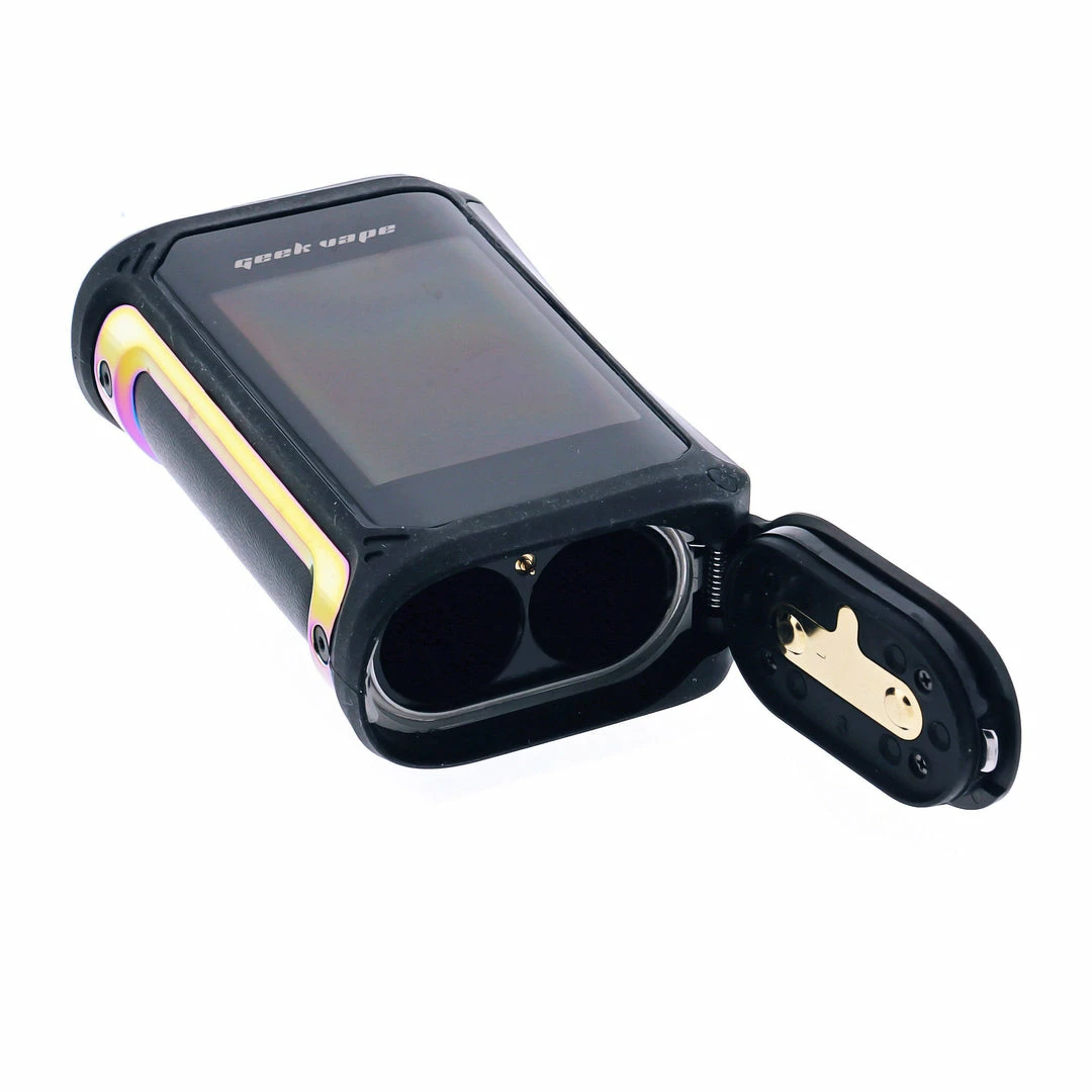 This mod is powered by two 18650 batteries that support a maximum power output of 200W. Easily insert and remove batteries by opening the spring loaded cover on the bottom of the device. At the top of the device, you find a centered, gold-plated 510 connection to attach tanks up to 27mm in diameter, along with a Micro-USB port for upgrading firmware.